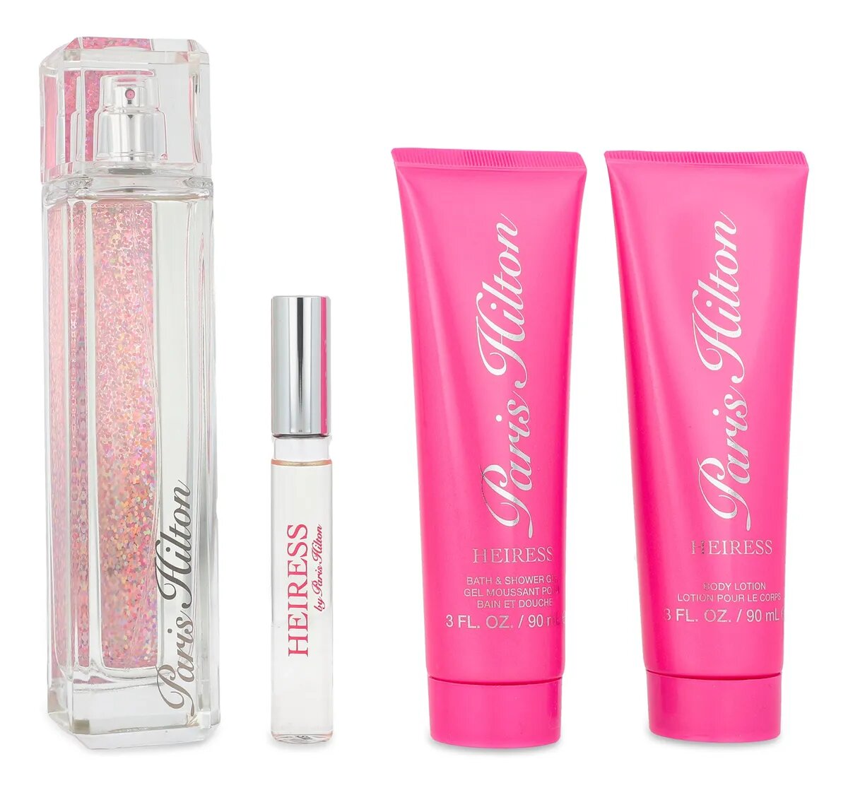 Heiress de Paris Hilton es una fragancia de la familia olfativa Floral Frutal para Mujeres. Heiress se lanzó en 2006. Las Notas de Salida son maracuyá (fruta de la pasión), champaña, durazno (melocotón), mimosa y naranja; las Notas de Corazón son granadina, madreselva, flor de tiaré, ylang-ylang y jazmín de estrella; las Notas de Fondo son haba tonka, hojas de violeta y maderas blancas.
