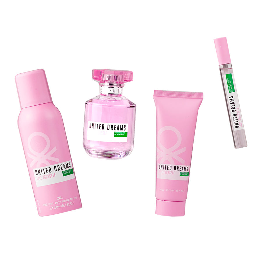 SET LOVE YOURSELF EDT 80ML + DESODORANTE 150ML + BODYLOTION 75ML + PERFUMERO BENETTON PERFUME PARA DAMA