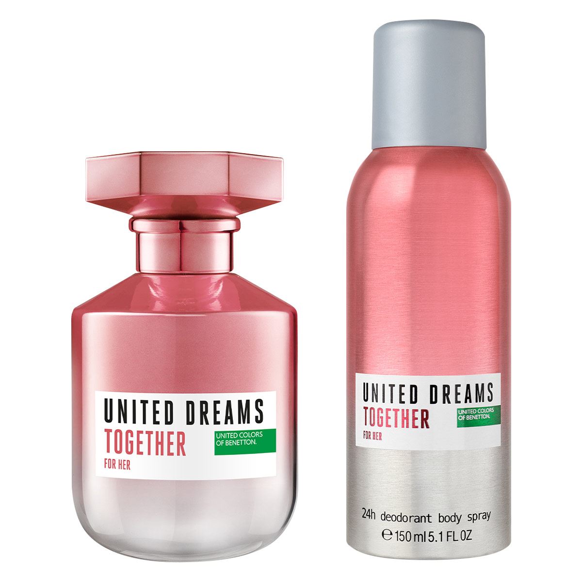 United Dreams Together for Her de Benetton la nueva fragancia personalizable de Benetton. Fragancia frutal mezcla de notas frutales con bergamota y un bouquet floral con magnolia, rosa y jazmín, combinado con vainilla y almizcle. Para personalizar, rocía tu fragancia en cuello y muñecas, aplica el booster AM para crear un aroma mas fresco y el booster PM para crear un aroma más intenso. Descubre United Dreams Together para ella, el perfume femenino de la máxima expresión del amor: un fresco beso