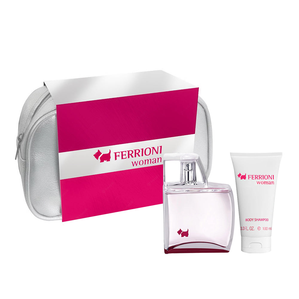 SET WOMAN EDP 100ML + BODY SHAMPOO 100ML + COSMETIQUERA FERRIONI PERFUME PARA DAMA