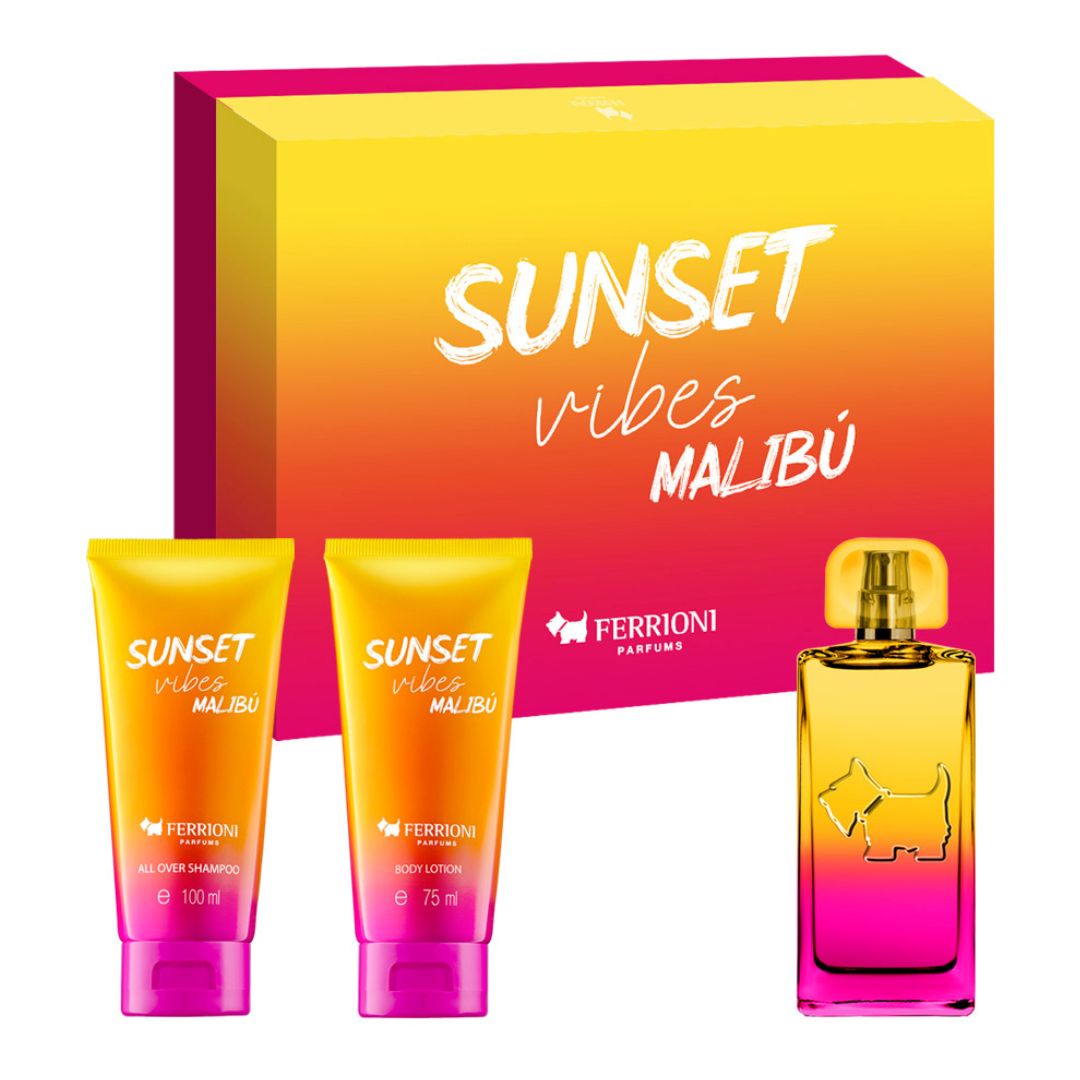 SET SUNSET VIBES MALIBU EDT 100ML + SHAMPOO 75ML + CREMA COPORAL 75ML FERRIONI PERFUME PARA DAMA