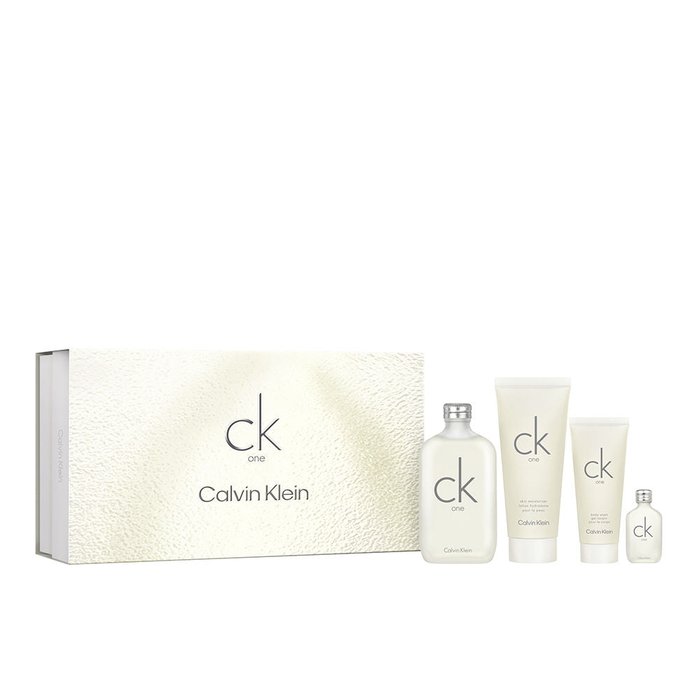 CK One de Calvin Klein es una fragancia de la familia olfativa Cítrica Aromática para Hombres y Mujeres. CK One se lanzó en 1994. CK One fue creada por Alberto Morillas y Harry Fremont. Las Notas de Salida son limón (lima ácida), notas verdes, bergamota, mandarina, piña, cardamomo y papaya; las Notas de Corazón son lirio de los valles (muguete), jazmín, violeta, rosa, nuez moscada, raíz de lirio y fresia; las Notas de Fondo son acordes verdes, almizcle, cedro, té verde, sándalo, musgo de roble y ámbar. El set incluye: CK ONE EDT 200ML + LOCION HIDRATANTE 200ML + GEL DE DUCHA 100ML + MINI 15ML