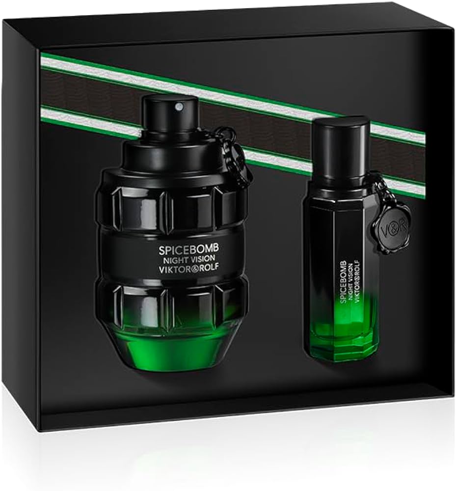 Spicebomb Night Vision Eau de Toilette de Viktor&Rolf es una fragancia oriental fougère para hombre. Se lanzó en 2019. Fue creada por Nathalie Lorson y Pierre Negrin. Sus notas de salida son manzana Granny Smith, cardamomo, mandarina verde y pomelo; las notas de corazón son pimienta, salvia, nuez moscada, chile rojo, clavo y geranio; y las notas de fondo son haba tonka, notas amaderadas y almendra. El set incluye: SPICEBOMB NIGHT VISION EDT 90ML + PERFUMERO EDT 20ML